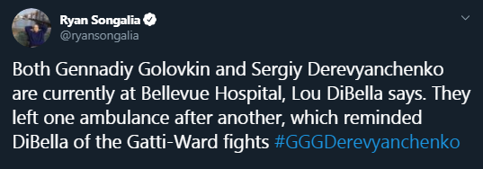 После боксерского поединка между украинцем Сергеем Деревянченко и казахским боксером Геннадием Головкиным ни один из спортсменов не остался на пресс-конференцию, оба отправились в больницу для профилактической проверки. Об этом в Twitter сообщил журналист The Ring Райан Сонгалия.