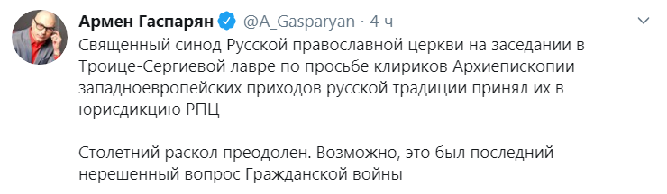 "Столетний раскол преодолен. Возможно, это был последний нерешенный вопрос Гражданской войны", - написал Гаспарян.
