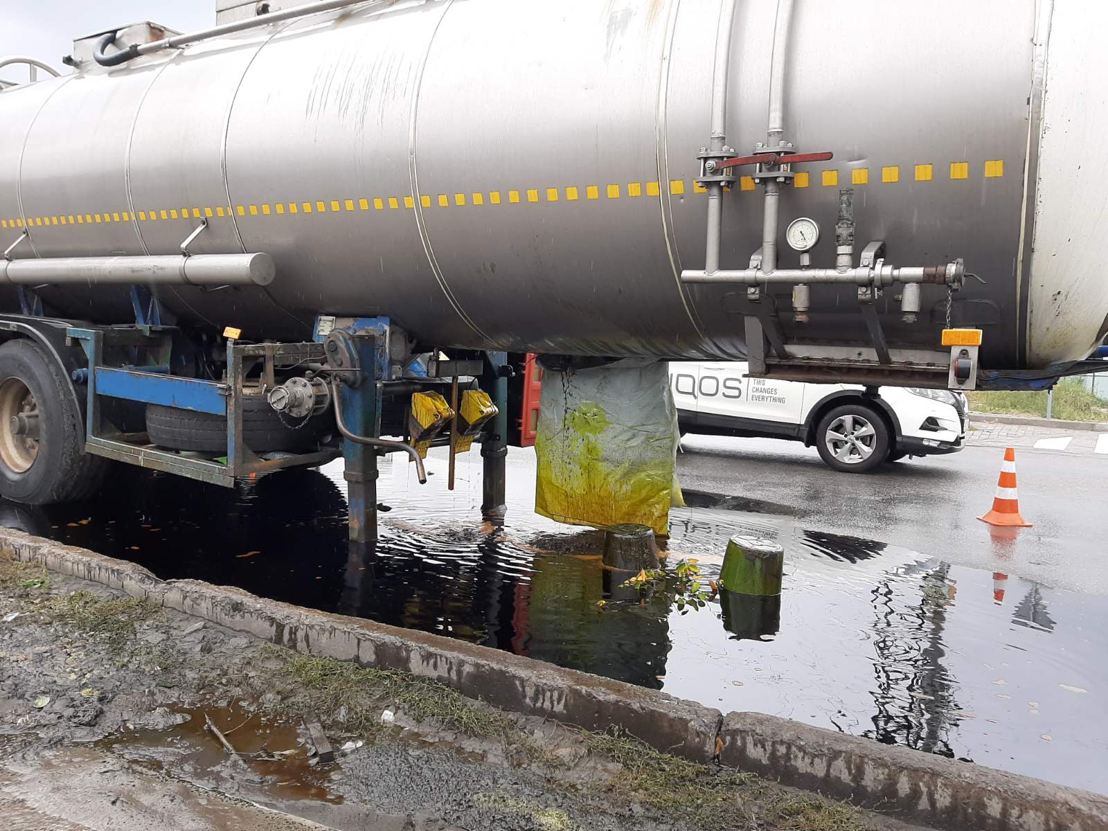 "7 октября 13:04 в Службу спасения "101" поступило сообщение от дежурного службы "102", что по адресу город Днепр, на углу улиц Журналистов и Винокурова, на обочине дороги стоит автомобильная цистерна без тягача, из которой вытекает неизвестное вещество. На место происшествия были направлены работники ГСЧС 18-й государственной пожарно-спасательной части, специалисты аварийно-спасательного отряда специального назначения и представители оперативно-координационного центра Главного управления", - говорится в сообщении.
