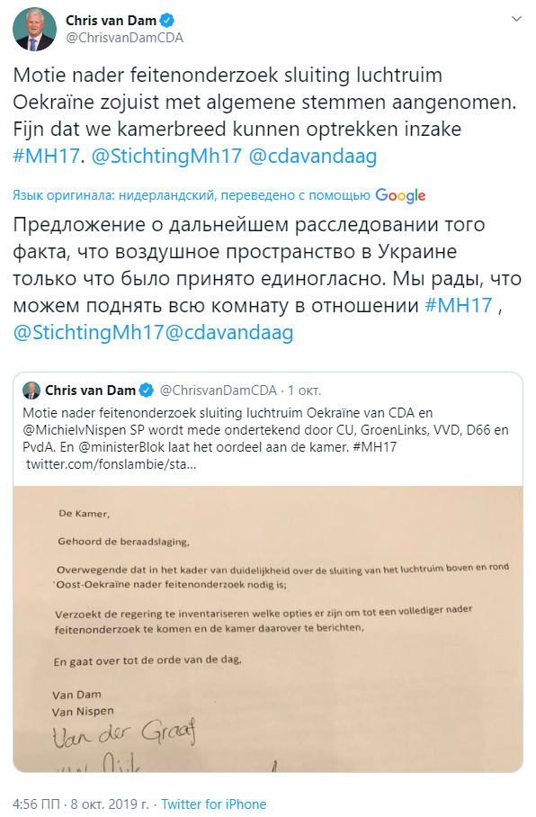 "Предложение относительно дальнейшего расследования того факта, что не было закрыто воздушное пространство над Украиной только что было принято единогласно. Мы рады, что можем поднять всю Палату в отношении #MH17", - написал в Twitter депутат от CDA Крис ван Дам.