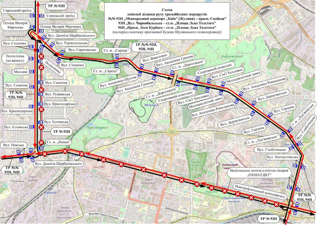 - троллейбусный маршрут № 93Н "Ул. Чернобыльская - ст. м. "Площадь Льва Толстого" организуется по трассе: ул. Чернобыльская - ул. Академика Ефремова - просп. Академика Палладина - просп. Победы - ул. Щербакивского - ул. Стеценко - ул. Академика Щусева - ул. Ильенко - ул. Сечевых Стрельцов - ул. Черновола - просп. Победы - бульв. Шевченко - ул. Большая Васильковская - ст. м "Площадь Льва Толстого" (в обратном направлении ул. Льва Толстого - ул. Владимирская - бульв. Тараса Шевченко);