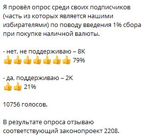По его словам, сделал он это после опроса среди своих подписчиков. "Я провел опрос среди своих подписчиков (часть из которых является нашими избирателями) по поводу введения 1% сбора при покупке наличной валюты", - сообщил Дубинский и привел результаты голосования: не поддержали законопроект 79% подписчиков, поддержали - 21%. "В результате опроса отзываю соответствующий законопроект 2208", - подытожил нардеп.