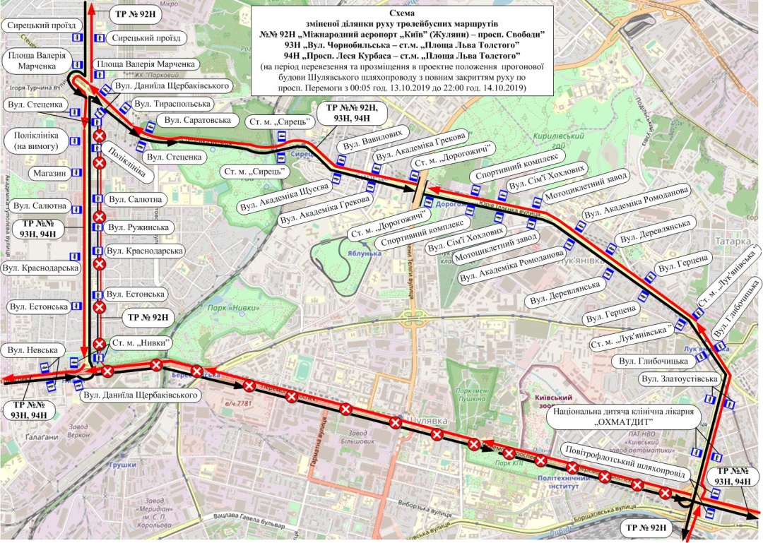 Кроме того, вносятся временные изменения в маршрут следования ночных троллейбусных маршрутов: - троллейбусный маршрут № 92Н "Международный аэропорт "Киев" (Жуляны) - ул. Свободы", организуется по трассе: ул. Свободы - ул. В. Порика - пр-т Правды - ул. Маршала Гречко - ул. Стеценко - ул. Академика Щусева - ул. Ю.Ильенко - вул. Сечевых Стрельцов - ул. В. Чорновила - просп. Воздухофлотский - ул. И. Огиенко - ул. Георгия Кирпы - ул. Ползунова - ул. И. Огиенко - просп. Воздухофлотский (в обратном направлении ул. Народного Ополчения) - Международный аэропорт "Киев" (Жуляны); - троллейбусный маршрут № 93Н "ул. Чернобыльская - ст. м. "Площадь Льва Толстого", организуется по трассе: ул. Чернобыльская - ул. Академика Ефремова - ул. Академика Палладина - ул. Победы - ул. Д. Щербаковского - ул. Стеценко - ул. Академика Щусева - ул. Ю. Ильенко - ул. Сечевых Стрельцов - ул. В. Чорновила - просп. Победы - бул. Т. Шевченко - ул. Большая Васильковская - ст. м "Площадь Льва Толстого" (в обратном направлении ул. Льва Толстого - ул. Владимирская - ул. Тараса Шевченко);