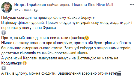 Первые отзывы о ленте в основном положительные. Некоторые зрители пишут, что фильм получился мирового уровня и на него нужно обязательно идти, другие отмечают, что местами сюжет слишком затянут и скучноват, а украинский "Захар Беркут" получился слишком американо-британским и даже Карпаты там напоминают то ли шотландские холмы, то ли Кордильеры.