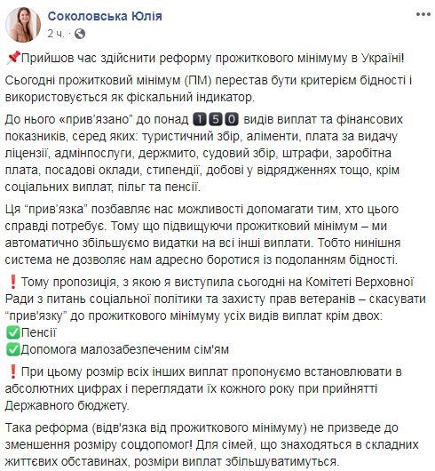 "Пришло время осуществить реформу прожиточного минимума в Украине!", - отметила Соколовская.