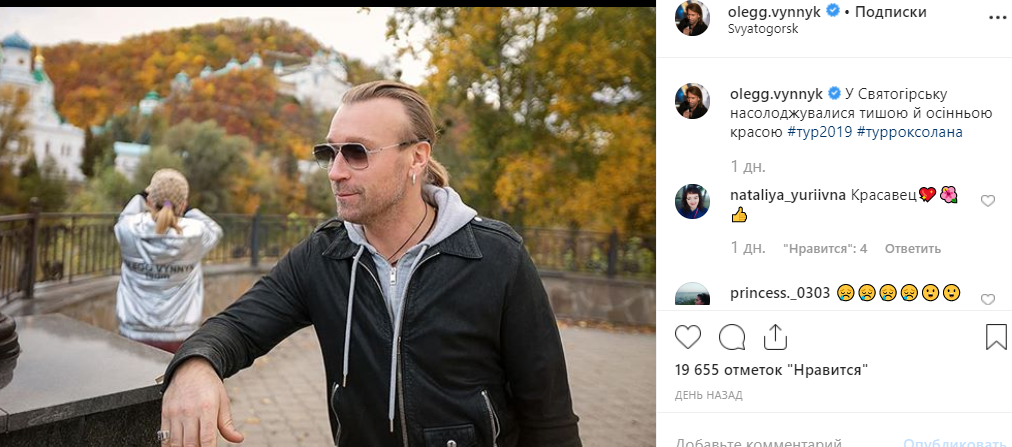 Популярный украинский певец Олег Винник, концерт которого недавно пикетировали в Суммах за высказывания про Крым, на днях посетил Святогорск в Донецкой области. Фото с севера Донбасса 46-летний артист опубликовал на своей странице в Instagram.