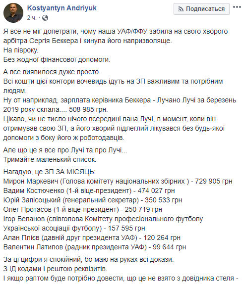 "Я все не мог сообразить, почему наша УАФ забила своего больного арбитра Сергея Беккера и бросила его на произвол судьбы. На полгода. Без финансовой помощи. А все оказалось очень просто. Все средства этой конторы очевидно идут на ЗП важным и нужным людям. Ну вот, например, зарплата Лучано Лучи за март 2019 года составила 508 985 гривен", - рассказал он.