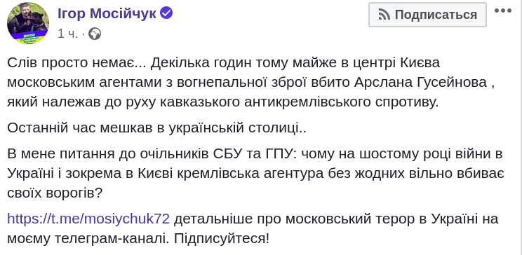 По словам бывшего нардепа, застрелили Арслана Гусейнова, который принадлежал к движению "кавказского антикремлевского сопротивления". Об этом Игорь Мосейчук сообщил на Facebook.
