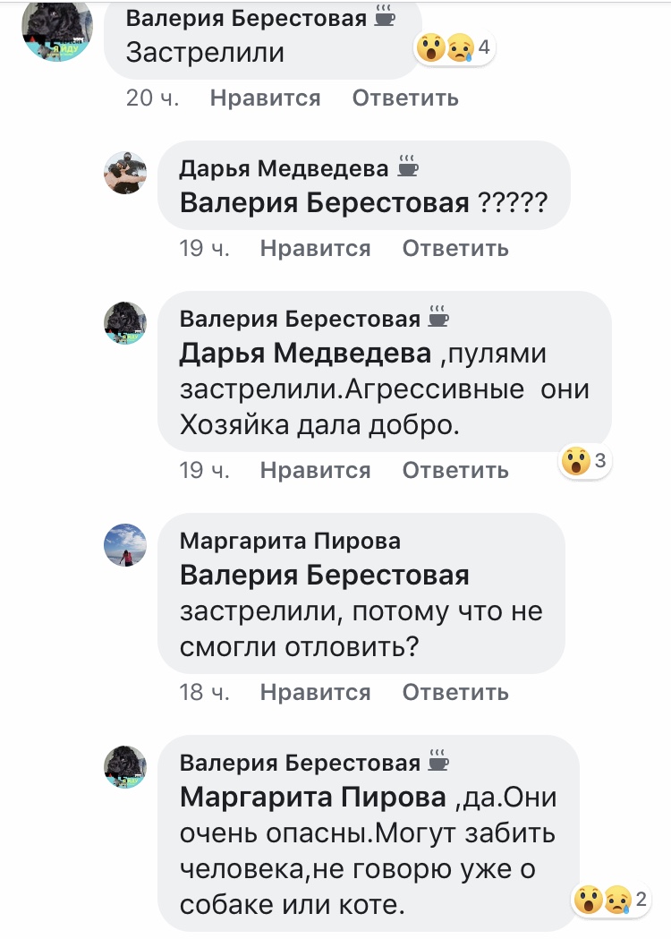 Поскольку отловить страусов не удалось, с разрешения хозяйки было принято решение их застрелить.  Сколько страусов напали на убежище и были убиты, зоозащитники не сообщают. Коты не пострадали.