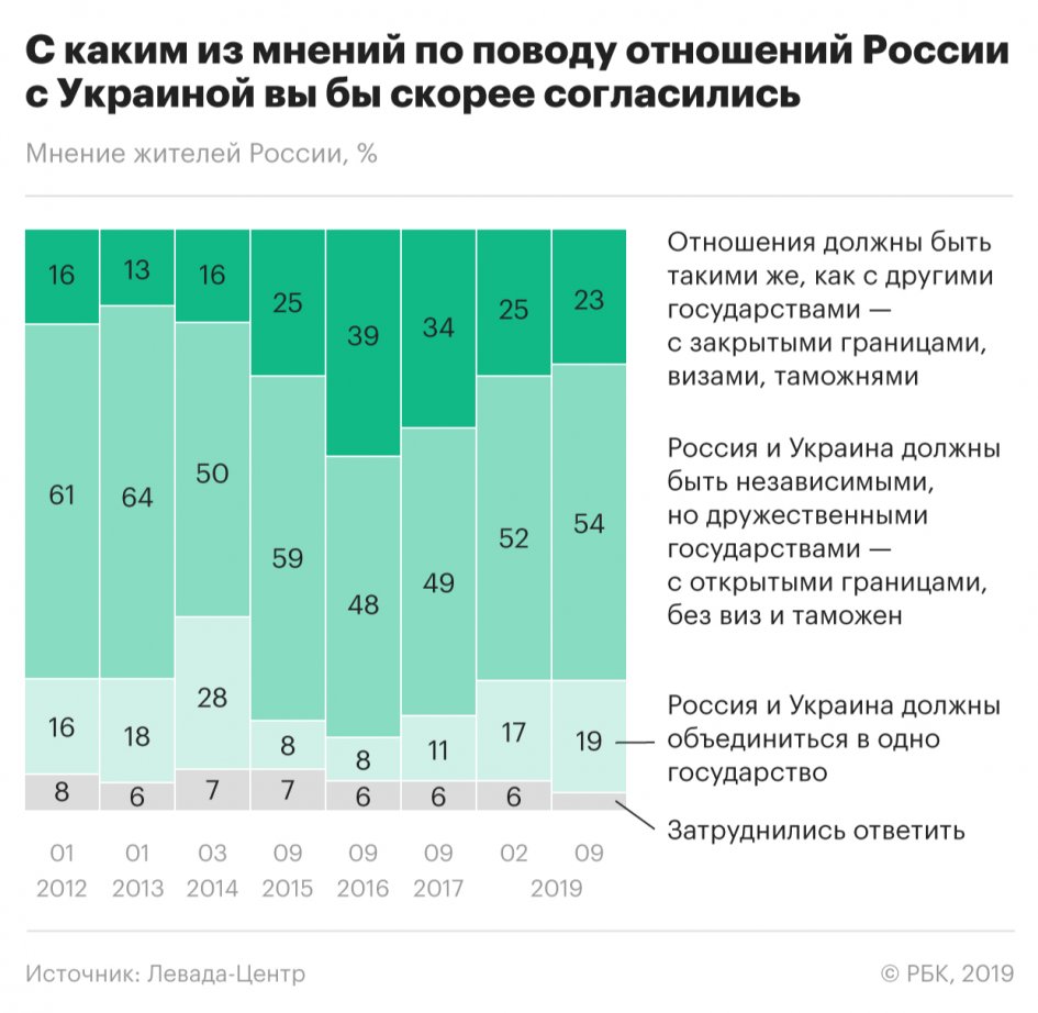 Избрание Владимира Зеленского президентом Украины в апреле этого года и первые шаги на взаимодействие (в том числе произошедший обмен удерживаемыми лицами) переломили доминирование "плохого" отношения россиян к соседней стране", - предположила социолог "Левада-центра" Карина Пипия и добавила, что такое негативное отношение сохранялось в "посткрымский" период.