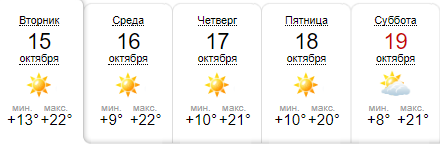 Сайт Weather.com сообщает, что в ближайшие дни погода будет преимущественно солнечной. Самым теплым днем будет 15 октября, когда температура поднимется до +23. В среду и четверг, 16 и 17 октября, будет до +22 днем и +7 ночью. Такая погода продержится до конца недели.