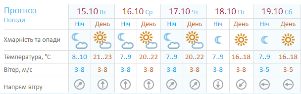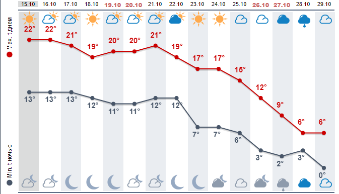 Прогноз Мeteoprog.ua показывает, что в ближайшие 10 дней днем термометры будут показывать в среднем +19...+22. Ночью +11...+13. Похолодание начнется с 25 октября. С этого дня небо затянут тучи, а температура воздуха постепенно опустится с +15 до +6. А ночью 29 октября ночью температура спустится до 0.