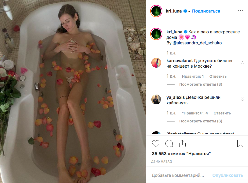 29-летняя украинская певица Кристина Герасимова, которая выступает под псевдонимом Луна, опубликовала на своей странице в Инстаграм фото, где она лежит голой в ванной.