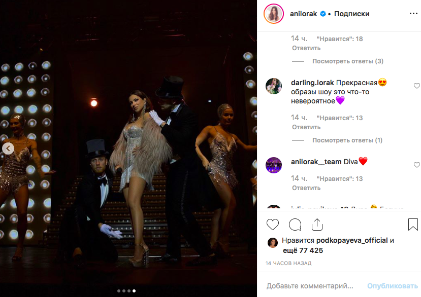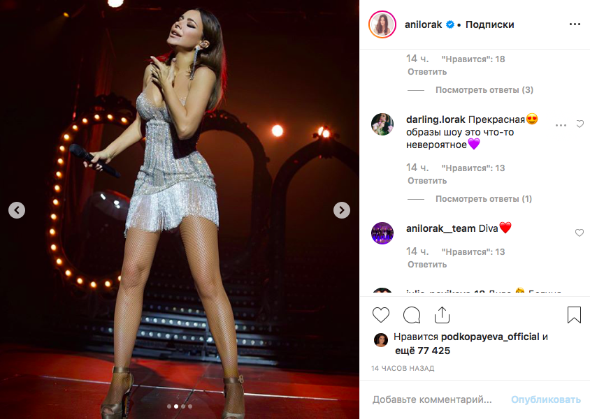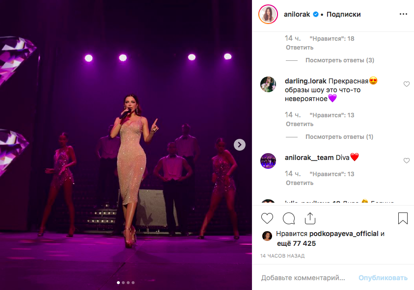 "Вы шикарна", "Самая лучшая! Дива! Спасибо за все! Вы мое вдохновение, мой идол", "Спасибо за все, что делаете для нас. Мы это чувствуем и на концертах стараемся отдать всю вашу любовь взамен, вы наше солнце. Спасибо тысячу раз",  - пишут Ани Лорак поклонники.