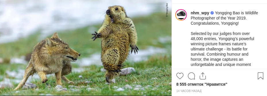 Фотограф Йонгкинг Бао из Китая выиграл в категории лучшей фотографии дикой природы 2019. Победу он получил за снимок лисы и сурка, сделанный в горах Циляньшань. Об этом сообщает официальный аккаунт конкурса Wildlife Photographer Of The Year в Instagram.