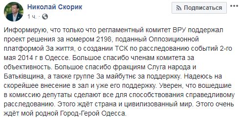 Регламентный комитет Верховной Рады поддержал проект решения №2198, поданный Оппозиционной платформой - За жизнь, о создании временной следственной комиссии (ВСК) по расследованию событий 2-го мая 2014 года в Одессе. Об этом сообщил нардеп из ОПЗЖ Николай Скорик в Facebook.