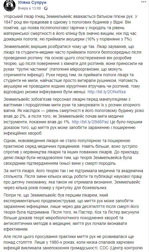 Экс-министр здравоохранения Ульяна Супрун рассказала о важной и простой процедуре - гигиене рук, которая значительно снизила распространение опасных инфекций и смертность от них.