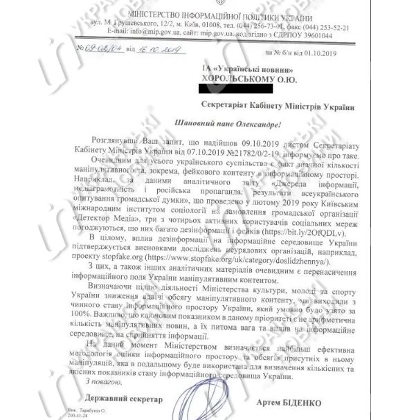 Ответ пришел из Министерства информационной политики (находится в стадии реорганизации и оперативно подчинено министру культуры, молодежи и спорта Владимиру Бородянскому) за подписью государственного секретаря министерства Артема Биденко. В нем уточняется, что какие-либо цифры при написании документа не использовались.
