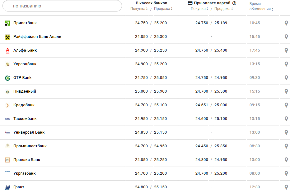 В банках курс доллара с утра был такой: покупка от 24,50 до 24,85 грн, продают от 24,85 до 25,45 грн.