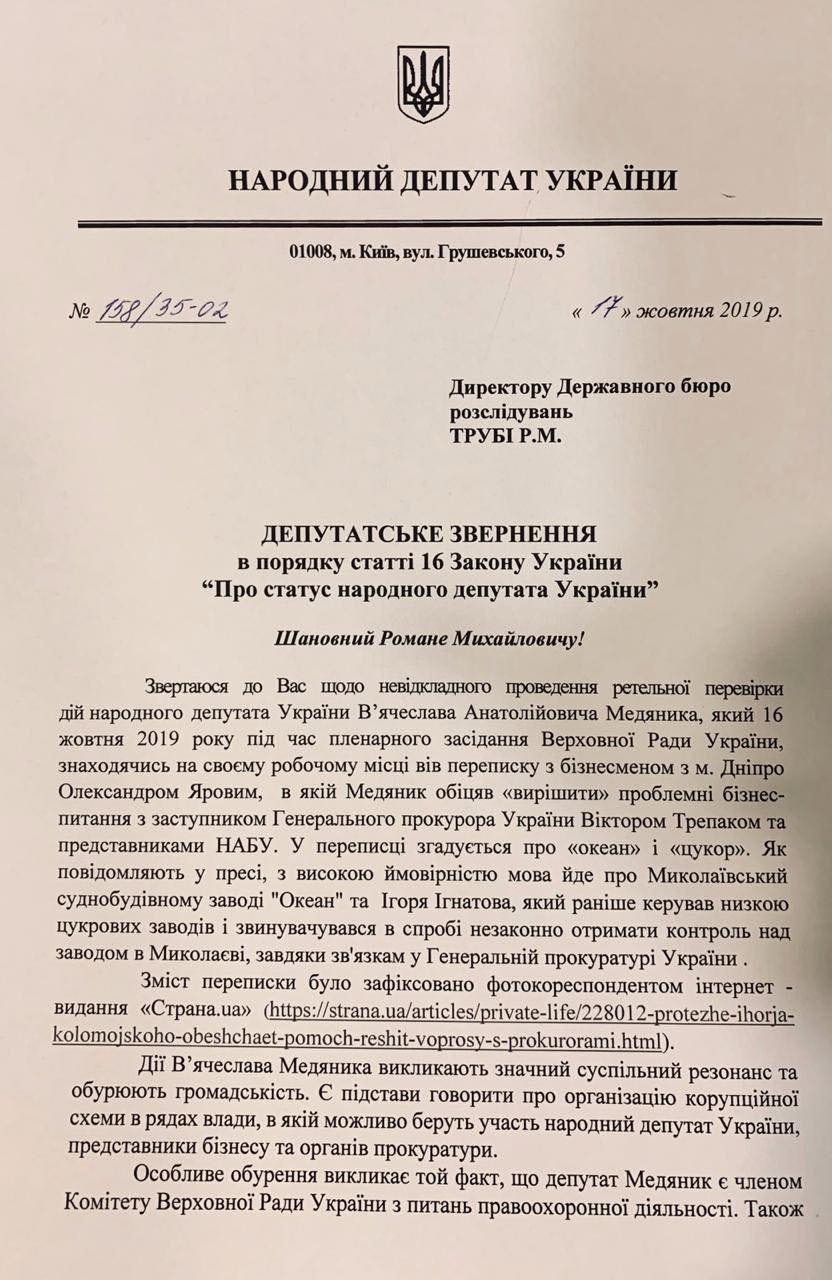 16 октября фотокорреспондент "Страны" снял странную переписку депутата Вячеслава Медяника, где он обещал контакту "Саша Яровой" помочь с решением вопросов по поводу "океана" и "сахара" и помочь решить проблемы с Генеральной прокуратурой и НАБУ, а также поговорить по поводу "сахара" с заместителем генерального прокурора Украины Виктором Трепаком.