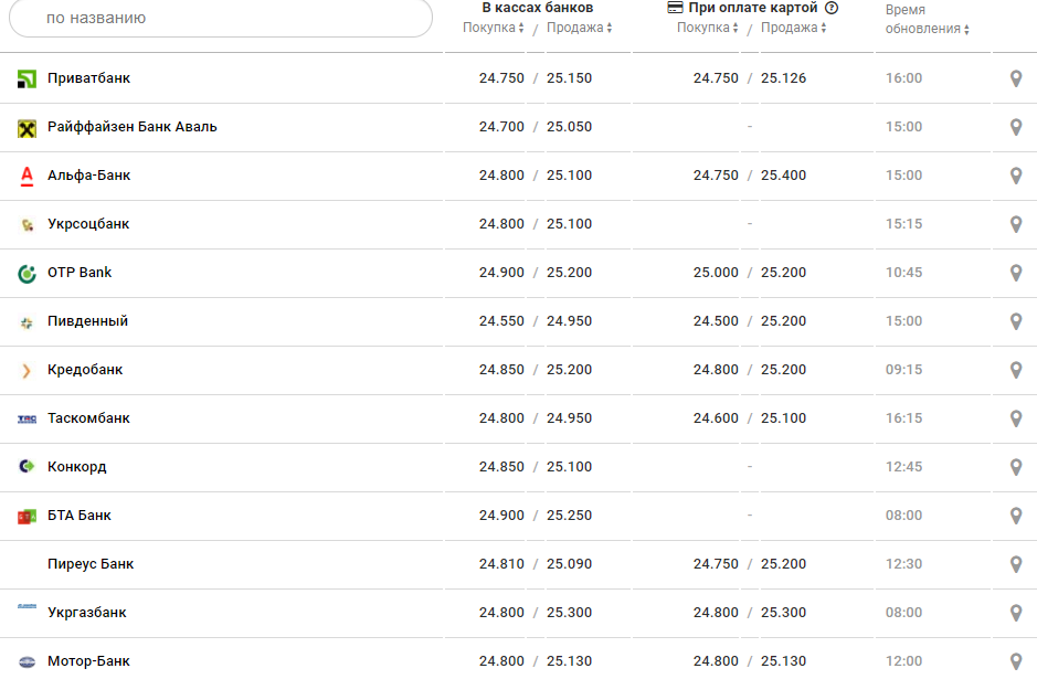 В банках курс доллара с утра был такой: покупка от 24,50 до 25,05 грн, продажа - от 24,99 до 25,90 грн.