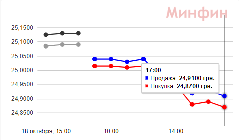 21 октября курс доллара в обменках за день незначительно подешевел: валюту покупают за 24,87 грн, продают за 24,94 грн. Межбанк закрылся удешевлением на 22 копейки, показав следующие котировки: 24,87 грн - покупка, 24,91 грн - продажа. В банках вечером доллар покупают от 24,55 до 24,93 грн, продают от 24,93 до 25,60 грн.