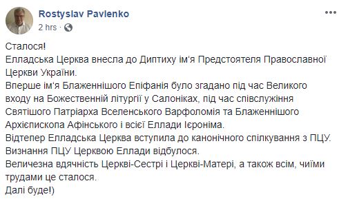 "Элладская церковь внесла в диптих имя предстоятеля Православной церкви Украины. Впервые имя Блаженнейшего Епифания было упомянуто во время великого входа на Божественной литургии в Салониках, во время сослужения Святейшего Патриарха Вселенского Варфоломея и Блаженнейшего архиепископа Афинского и всей Эллады Иеронима. Теперь Элладская церковь вступила в каноническое общение с ПЦУ. Признание ПЦУ Церковью Эллады произошло", - написал он.