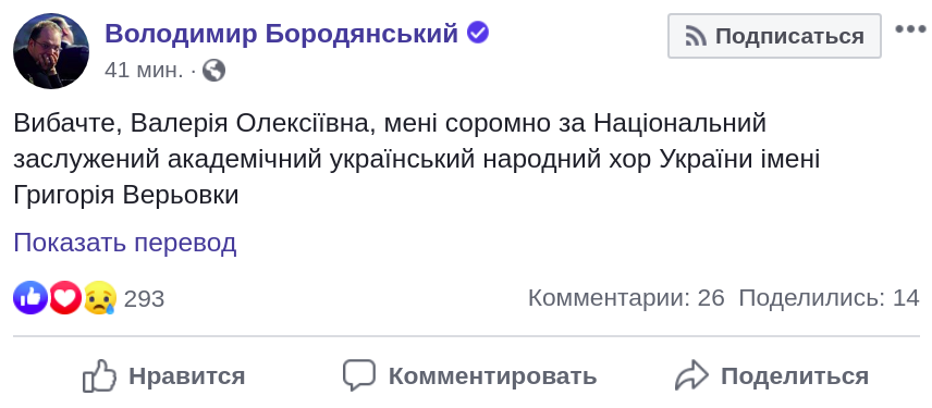 "Простите, Валерия Алексеевна, мне стыдно за Национальный заслуженный академический украинский народный хор Украины имени Григория Веревки", - написал министр культуры в Facebook.