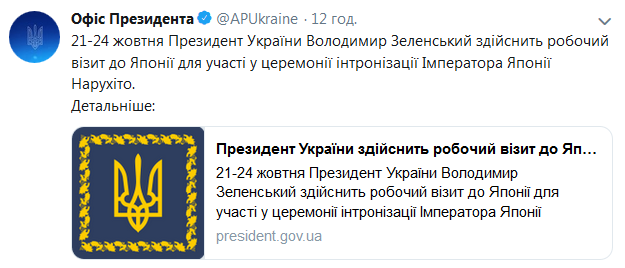 "21-24 октября президент Украины Владимир Зеленский с рабочим визитом в Японию. Программой визита предусмотрены встречи главы государства с премьер-министром Японии Синдзо Абэ, руководителями обеих палат парламента Японии, членами японской парламентской ассоциации дружбы с Украиной, руководством Японского агентства международного развития и Японской ассоциации новой экономики, представителями японского бизнеса. Запланированы также ряд двусторонних встреч президента Украины с лидерами зарубежных стран",- уточнили в пресс-службе гаранта.