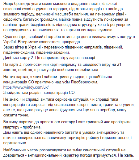 "Если принимать во внимание сезон массового опадения листьев, количества выкопанной сухой ботвы на огородах, подготовки городов и полей к зимнему периоду, огромные масштабы курения, на пещерном уровне - сознание многих граждан, почти полное отсутствие наказания за сжигания травы, бездействие соответствующих структур в хотя бы регулярных предупреждениях и объяснениях, то картина выглядит печальной", - написала Наталья Диденко.