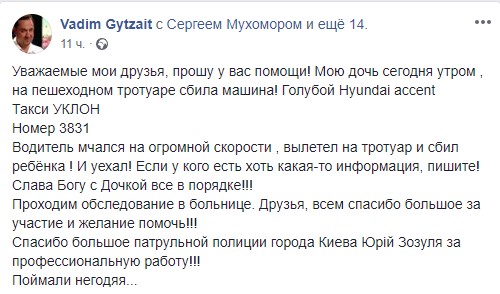 "Мою дочь сегодня утром, на пешеходном тротуаре сбила машина! Голубой Hyundai accent. Такси УКЛОН. Водитель мчался на огромной скорости, вылетел на тротуар и сбил ребёнка! И уехал", - написал Гутцайт.