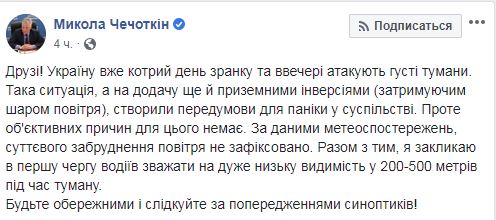 Существенного загрязнения воздуха на территории Украины, которое могло бы повлечь возникновение густых туманов в последние дни, не зафиксировано. этом заявил глава Государственной службы Украины по чрезвычайным ситуациям Николай Чечеткин на своей странице в Facebook.