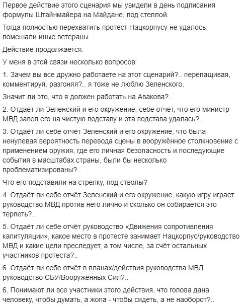 Словом, продолжает реализовываться сценарий руководства МВД на приватизацию протеста "Национальным корпусом", и перемещение Авакова в позицию, когда он выступает единственным гарантом разрешения непростой ситуации конфликта по линии "ОП - добровольцы".