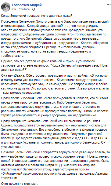 "Либо Зеленский берет под контроль все силовые структуры ,- а для этого надо отстранить от реальной власти Авакова,- и проводит свою политику . Либо не берет и теряет реальную власть и уходит досрочно, как недоразумение.