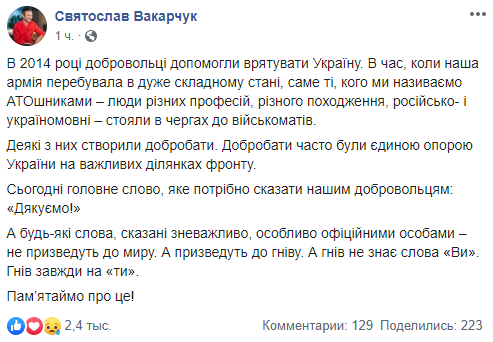 Народный депутат Украины, лидер партии "Голос" Святослав Вакарчук осудил общение президента Владимира Зеленского с добровольцами на Донбассе. Об этом он написал в Facebook.