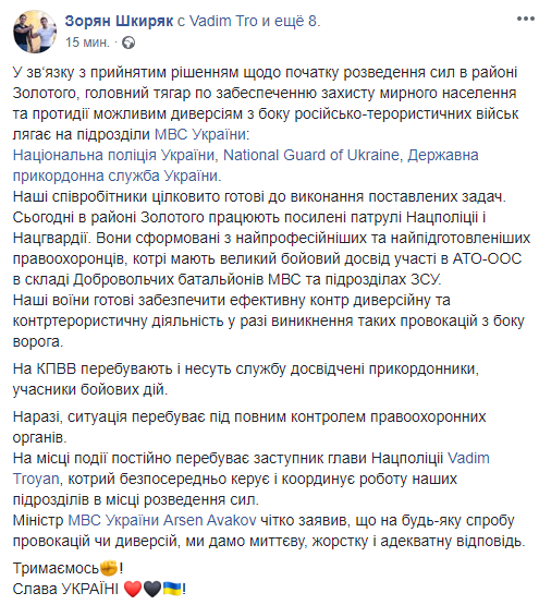 "Подтверждаю, что в Золотом уже начато разведение. А вот что за ситуация сейчас с Нацкорпусом, я не в курсе. Хотите мое мнение? Это незаконное вооруженное формирование!", - заявил он в комментарии СМИ.