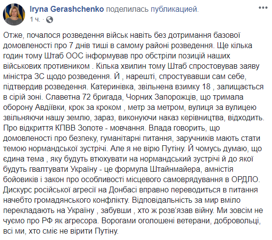 16:24 У Золотого оставила свои позиции 72-я бригада "черных запорожцев", написала в Facebook нардеп от "Евросолидарности" Ирина Геращенко, которая критикует отведение войск.