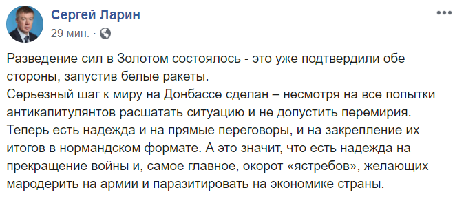 Серьезный шаг к миру на Донбассе сделан – несмотря на все попытки антикапитулянтов расшатать ситуацию и не допустить перемирия. Теперь есть надежда и на прямые переговоры, и на закрепление их итогов в нормандском формате. А это значит, что есть надежда на прекращение войны и, самое главное, окорот "ястребов", желающих мародерить на армии и паразитировать на экономике страны", - пишет нардеп "Оппозиционной платформы" Сергей Ларин.