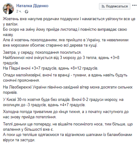 "Октябрь уже накупил родственникам подарки и пытается воткнуть все это в чемоданы. Потому что скоро на смену ему придет ноябрь и полностью оправдает свое название. Но и октябрь похолоданием, которое пришло в Украину, и небольшими уже морозами осыпает тщательно все деревья и кусты", - написала Диденко.