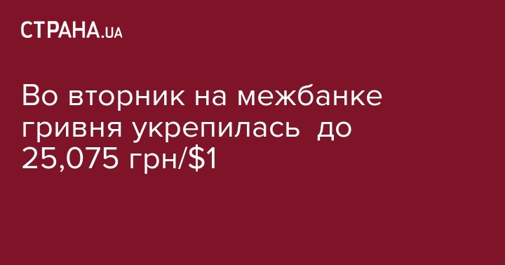 Во вторник, 29 октября, курс гривни на межбанке поднялся до 25,0750 грн/$1 с 25,1225 грн/$1 в предыдущий рабочий день. Об этом сообщили дилеры коммерческих банков, передает "Интерфакс-Украина".