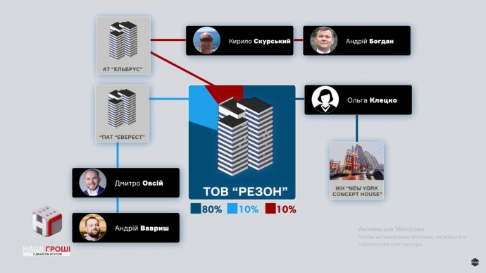 По данным авторов сюжета, у "Резона" три владельцав. Первый из них - Ольга Клецко, которая ранее уже была вовлечена в ряд предыдущих застроек компании Ваврыша. Второй владелец "Резон" - компания "Эверест", руководителем которой является Дмитрий Овсий - юрист и партнер Ваврыша. Третьим бенефициаром "Резона" является фирма "Эльбрус" с руководителем Кириллом Скурским.
