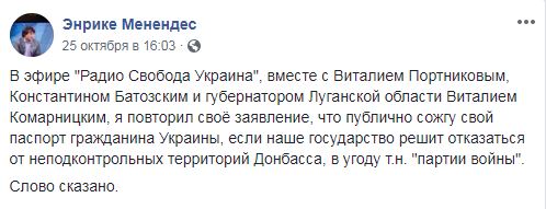 "В эфире "Радио Свобода Украина", вместе с Виталием Портниковым, Константином Батозским и губернатором Луганской области Виталием Комарницким, я повторил свое заявление, что публично сожгу свой паспорт гражданина Украины, если наше государство решит отказаться от неподконтрольных территорий Донбасса, в угоду т.н. "партии войны". Слово сказано", - заявил политолог.