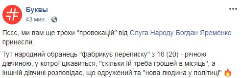 "Пссс, мы вам еще немного "провокаций" от Слуги Народа Богдан Яременко принесли. Здесь народный избранник "фабрикует переписку" с 18 (20)-летней девушкой, в которой интересуется, сколько ей нужно денег в месяц", а другой девушке рассказывает, что женат и "новый человек в политике", - сказано в комментарии издания к фотографиям.