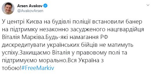 "Установили баннер в поддержку незаконно осужденного нацгвардейца Виталия Маркива. Любые старания РФ дискредитировать украинских бойцов не будут иметь успеха. Защищаем Виталия в правовом поле и поддерживаем морально. Вся Украины с тобой", - пишет Аваков.
