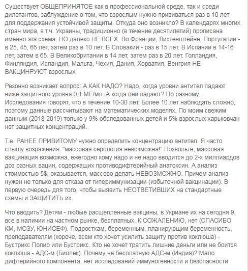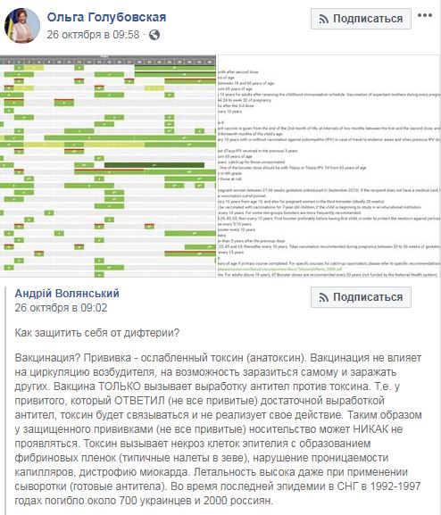 Такое заявление она озвучила после вопроса о том, почему, пока в Минздраве призывают вакцинироваться от дифтерии, советник министра Ольга Голубовская распространяет в Facebook информацию о том, что вакцина от дифтерии, закупленная за государственный счет, некачественная и что там мало дифтерийного компонента и нет исследований ее безопасности.