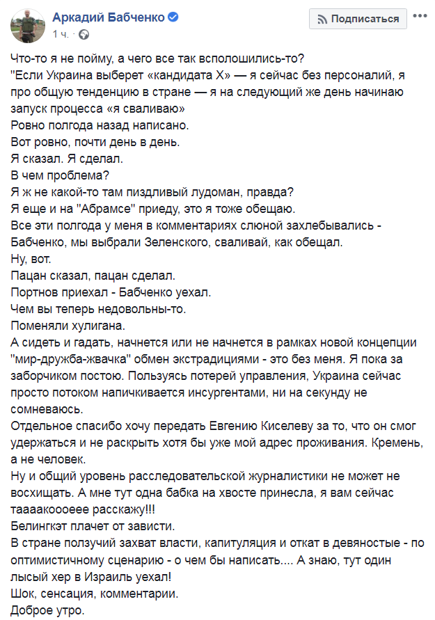 Бабченко в своей обычной манере напомнил, что во время президентской кампании дал обещание сменить место жительства, если выиграет определенный кандидат (очевидно, имелся в виду Зеленский). По словам журналиста, он просто исполнил обещание.