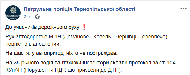 "К участникам дорожного движения! Движение по автодороге М-19 (Доманово - Ковель - Черновцы - Тереблече) полностью восстановлено", - сказано в записи в соцсети.