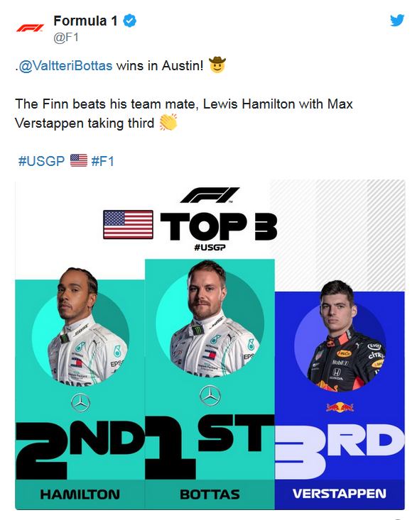Что касается Гран-при США, то как мы уже говорили, его победителем стал Боттас. Второе место занял Хэмилтон, третье - голландец Макс Ферстаппен из Red Bull.