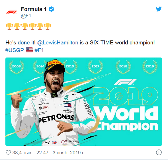 "Он сделал это. Хэмилтон шестикратный чемпион", - так отреагировала на успех гонщика пресс-служба "Формулы-1".