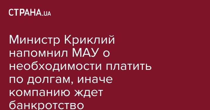 Международные авиалинии Украины (МАУ) должны решить вопрос долгов перед государством. Такое заявление сделал министр инфраструктуры Владислав Криклий в интервью РБК-Украина.
